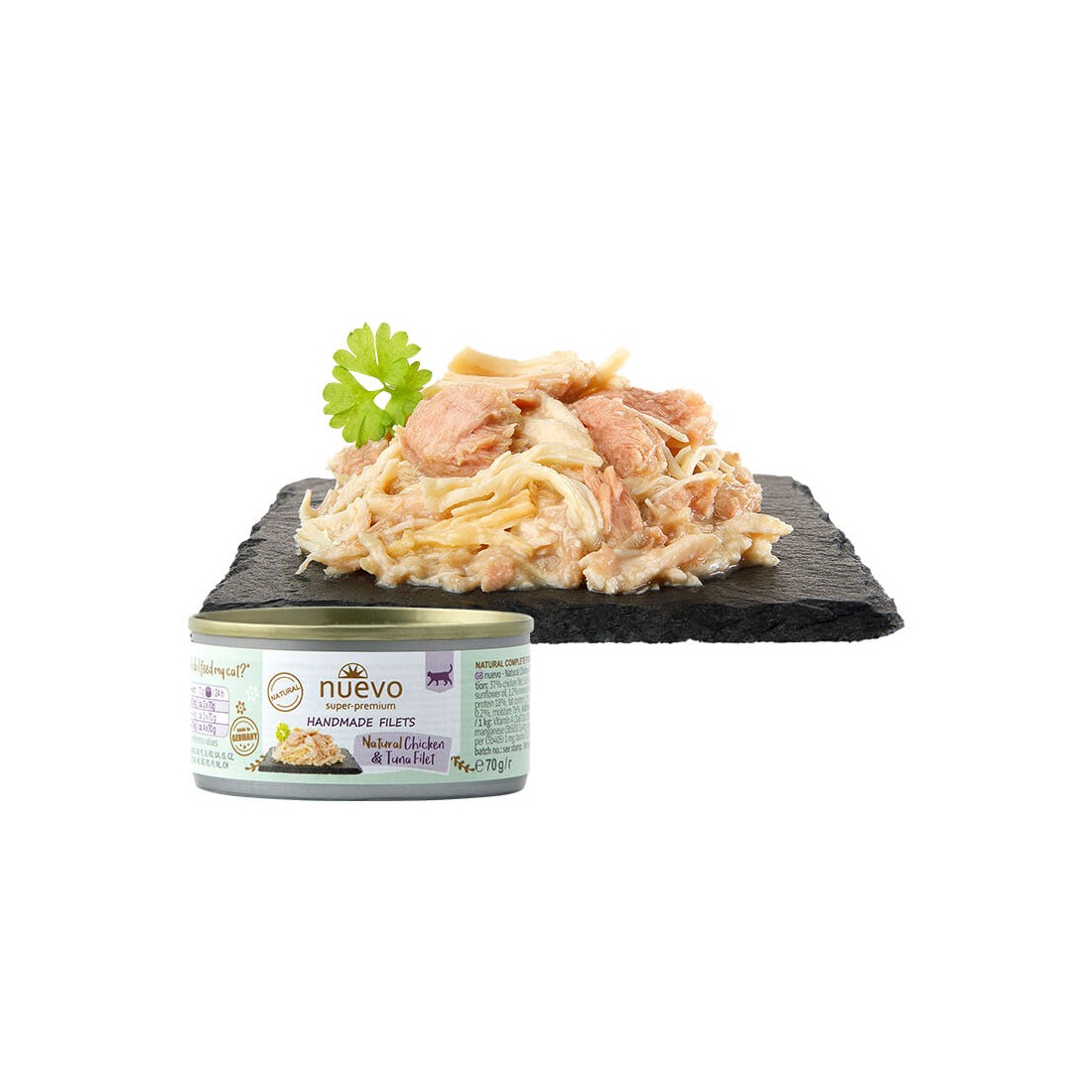Natūralus rankų darbo vištienos ir tuno filė sujungia du mėgstamiausius beveik bet kurios katės skonius. Dėl sodrios mėsos kartu su drebučiais, vitaminais ir mineralais šis patiekalas taps mėgstamiausiu jūsų keturkojo draugo ėdalu. Kadangi jame yra viskas, ko jūsų katei reikia kasdien, tai pirmasis tokio tipo pilnavertis šėrimo sprendimas, pagamintas rankomis iš geriausių minkštų filė.