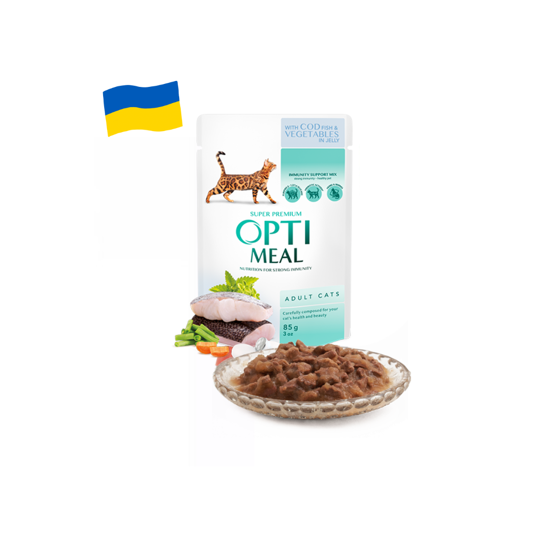 67% mėsa ir gyvulinės kilmės subproduktai gabaliukais ( įskaitant 15% iš vištienos, 10% iš galvijų širdžių ir kt.), žuvis ir žuvies produktai (18% menkės gabaliukai), augalinių baltymų ekstraktai, daržovės (morkos, ne mažiau 2 %, pupelės, ne mažiau 2 %), mineralai, aliejai ir riebalai (lašišos taukai, agurklės aliejus), augalinės kilmės produktai (tame tarpe spanguolės 0,05 %, serentis (liuteino šaltinis) 0,01 %, varnalėšos šaknys, svilarožės šaknys, ramunėlių žiedai 0,01 %, dilgėlės 0,01 %, čiobreliai 0,01 %), cukrus, Actigen ® (prebiotiko šaltinis – mananooligosacharidai) 0,01 %, beta-1,3 / 1,6-gliukanai 0,01 %.