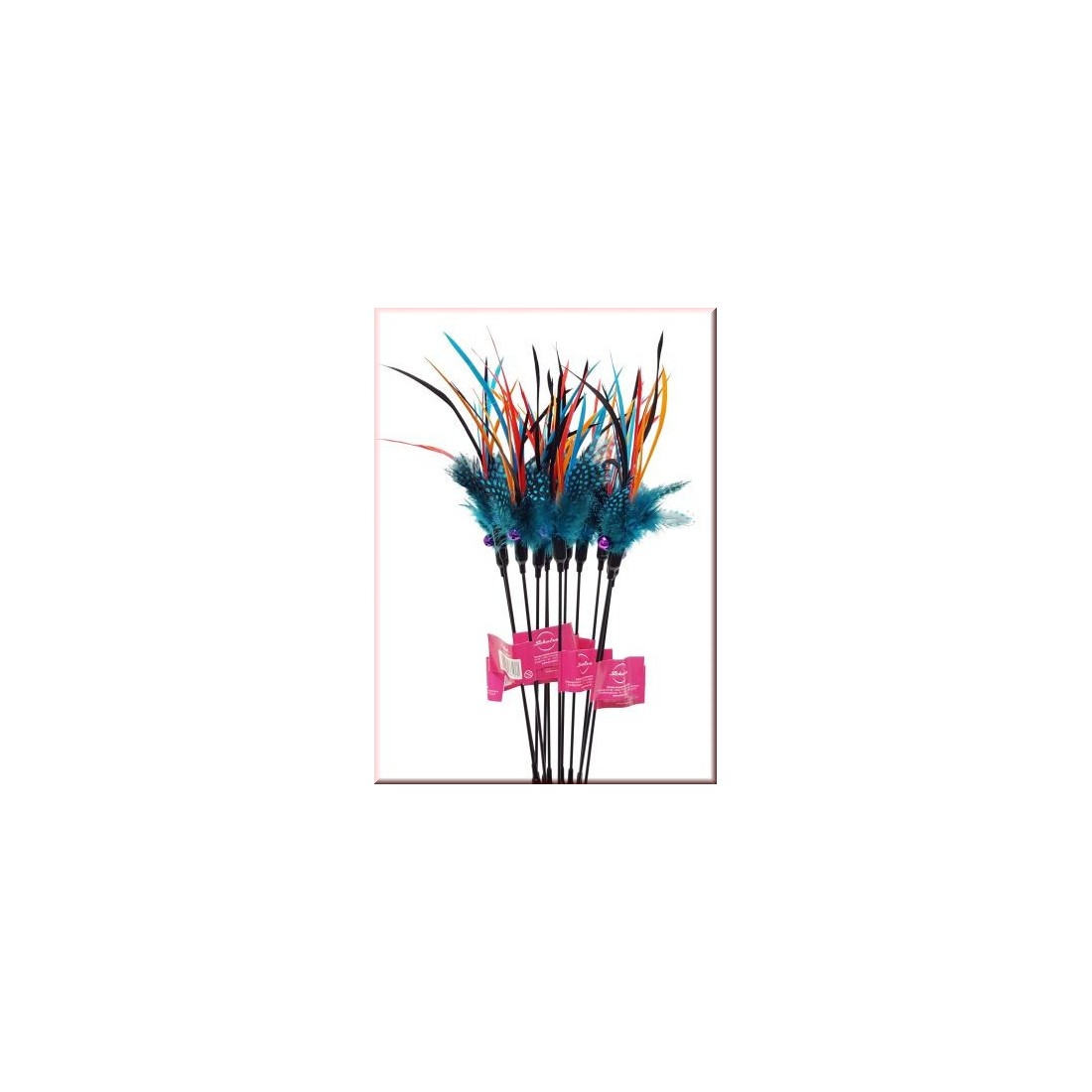 Žaislas katei ant pusiau lankstaus kotelio, su skambaliuku ir įvairiomis, spalvotomis plunksnomis. Skambaliukas atkreips net nusisukusios katės dėmesį, o skirtingo ilgio ir spalvų plunksnos tiesiog kvieste kvies nutverti plunksną ir pažaisti su šiuo kačių žaislu. Žaislo plunksnos tvirtai įklijuotos ir pakankamai atsparios katės antpuoliams :-)