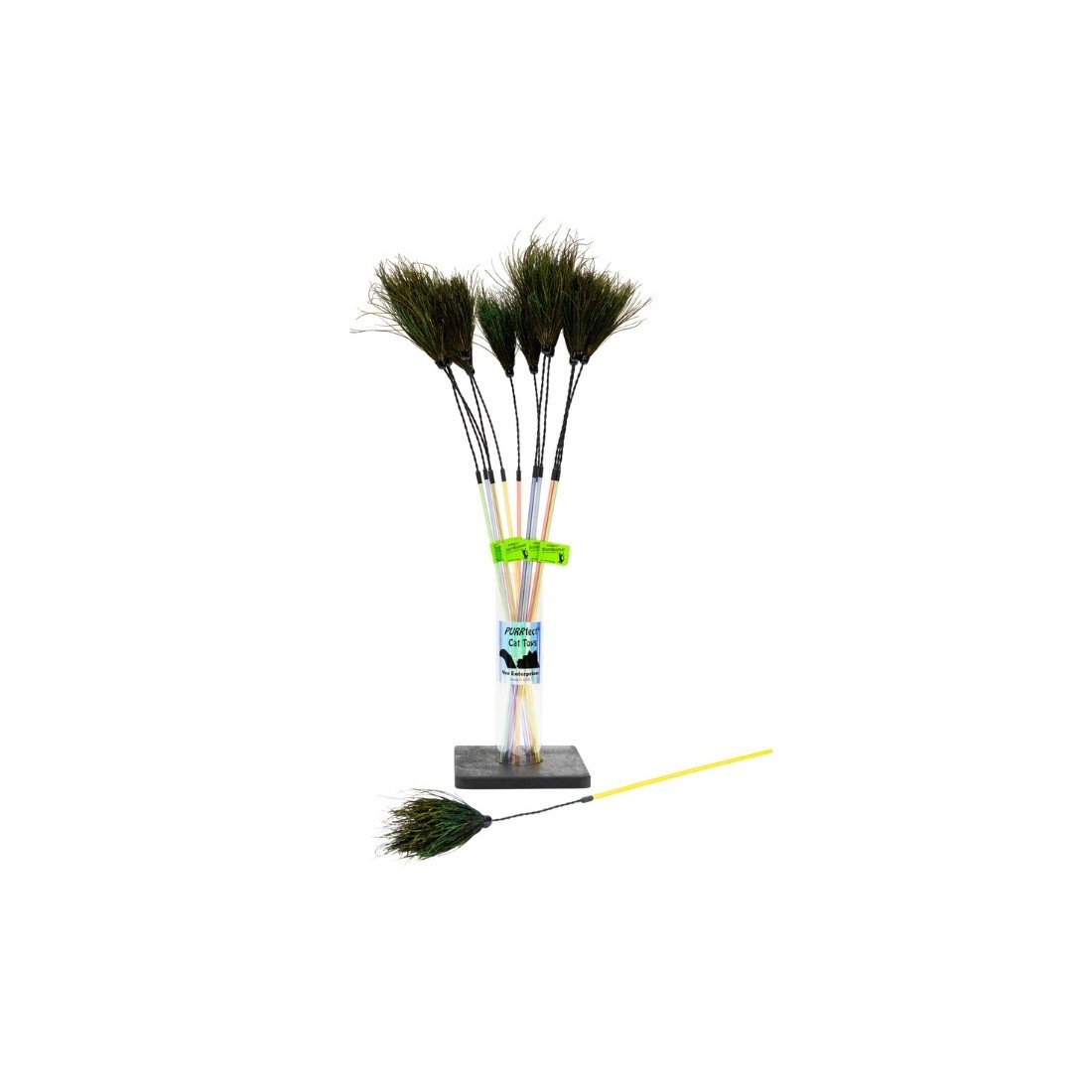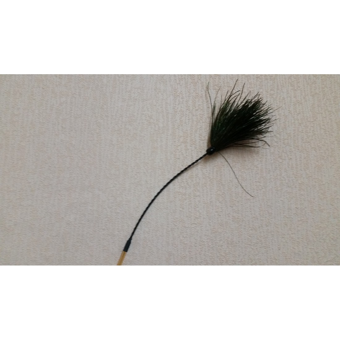 Aukštos kokybės žaislas katei ant pagaliuko su plonomis povo pluksnomis.