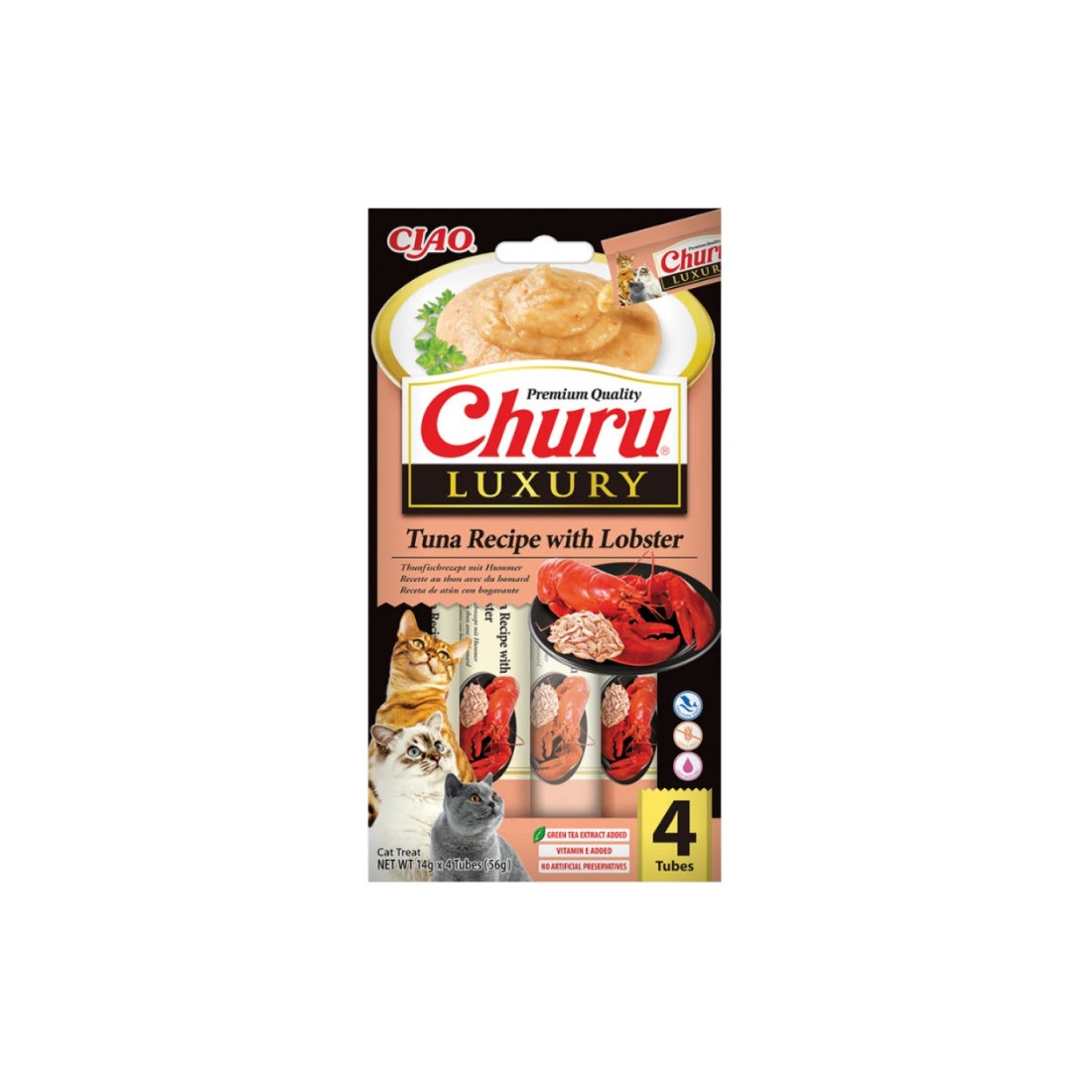 Churu kreminis skanėstas su tunu ir omarais katėms, padedantis palaikyti sveiką regėjimą bei stiprų imunitetą.