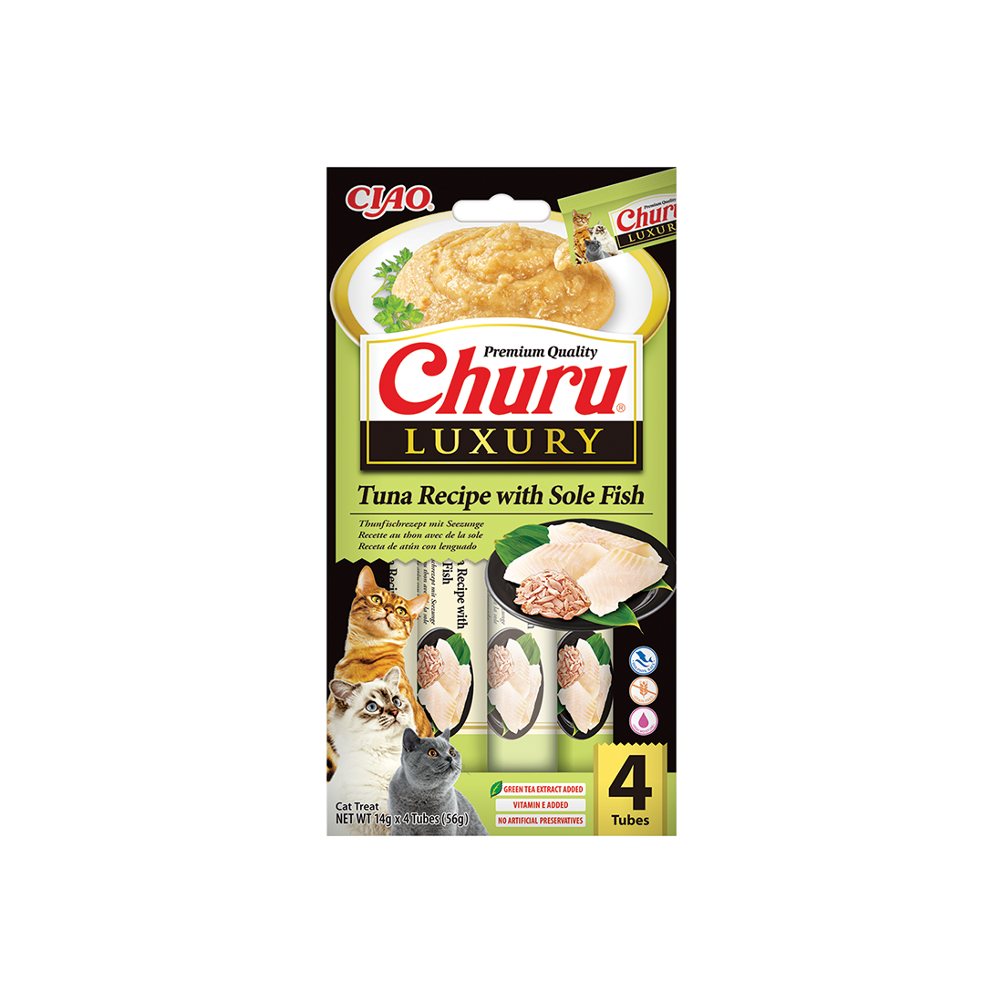 Churu kreminis skanėstas su tunu ir jūrų liežuviais (sole fish) katėms, padedantis palaikyti sveiką regėjimą bei stiprų imunitetą.